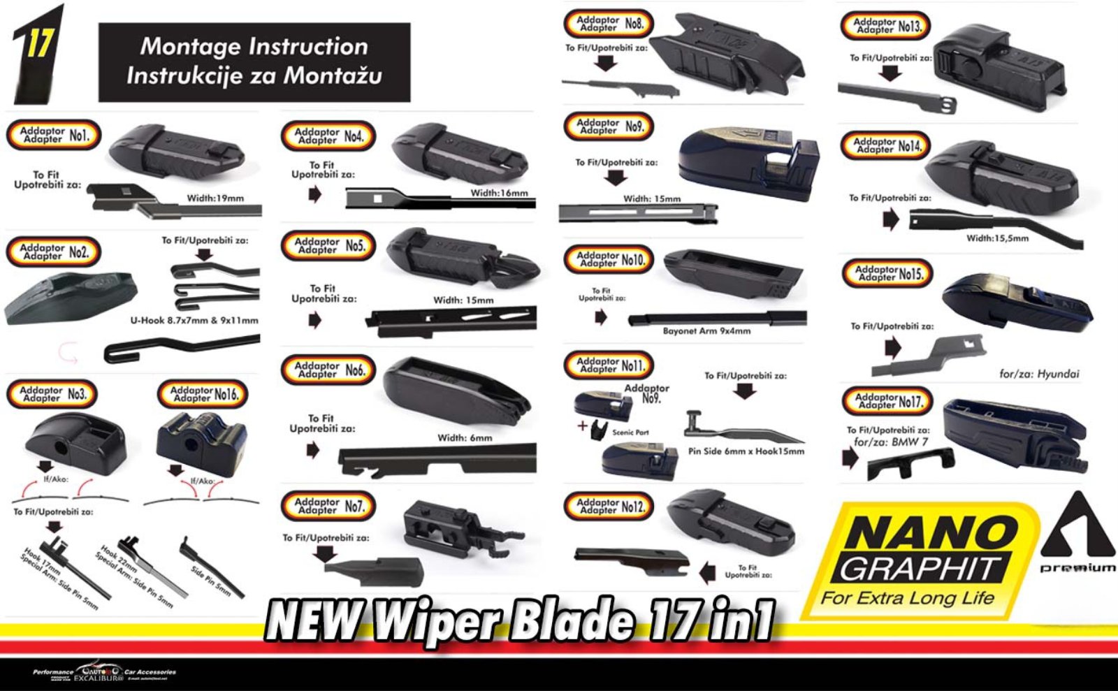 Svoju multifunkcionalnost daju 17+1 različitih adaptera, veoma lakih za menjanje, te se isti brisač može montirati na 99% vrsta različitih automobila.